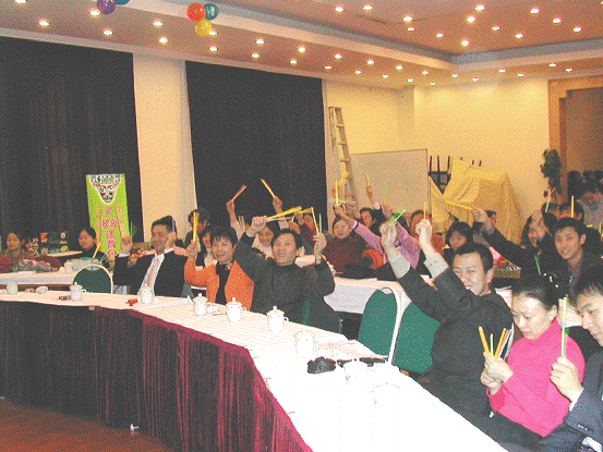 上海分公司领导带领全体员工挥动着手中欢乐之棒,庆祝商科成立十周年活动圆满闭幕