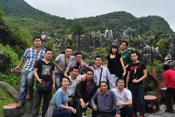 当天下午三点多我们又来到玉石林景区,它之所以叫玉石林是因为山上的石头属于玉白色,不同于昆明的花岗岩石林;一路行去,处处石林矗立、石芽裸露、奇峰突兀、石笋石柱狭缝密布;玉石林的小路涉及很科学,在不大的景区蜿蜒穿插,交错叠行,可以使游人充分运动,又能从不同角度去欣赏玉石林的特色;大家逢路必走,有坡必上,特别是在“一线天”,累的大汗淋漓,较上午的游姑婆山累多了。。。