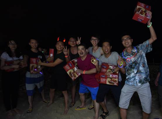 到了海边,除了体验美丽的海岛风情,当然还要享受海鲜大餐,鱼虾蟹贝,美味的晚餐盛宴,让大家大饱口福。大快朵颐之后,开始了篝火晚会。在海滩上,伴着阵阵的涛声,欢快的音乐声,大家挽着手,环成圈,跑着,跳着,忘却一切压力与烦恼,尽情欢畅。期间,还对下午比赛胜出的队伍进行了颁奖,没有获奖的队伍也不要沮丧哟,你们都是最棒的!