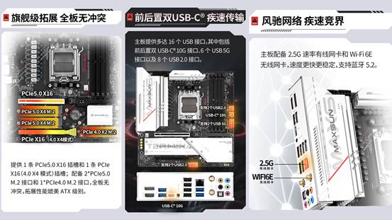 在扩展方面,该主板拓展性能媲美ATX级别,提供1条PCIe5.0 X16插槽和1条PCIeX16(4.0 X4模式)插槽;配备2*PCIe5.0 M.2接口和1*PCIe4.0 M.2接口,全板无冲突,轻松满足用户各种拓展需求。提供多达16个USB接口,方便连接各种外接设备,满足多样化使用需求,网络方面则配备2.5G速率有线网卡和Wi-Fi 6E无线网卡,支持蓝牙5.2,无论是在线游戏的低延迟需求,还是高清视频的流畅传输,都能轻松满足。