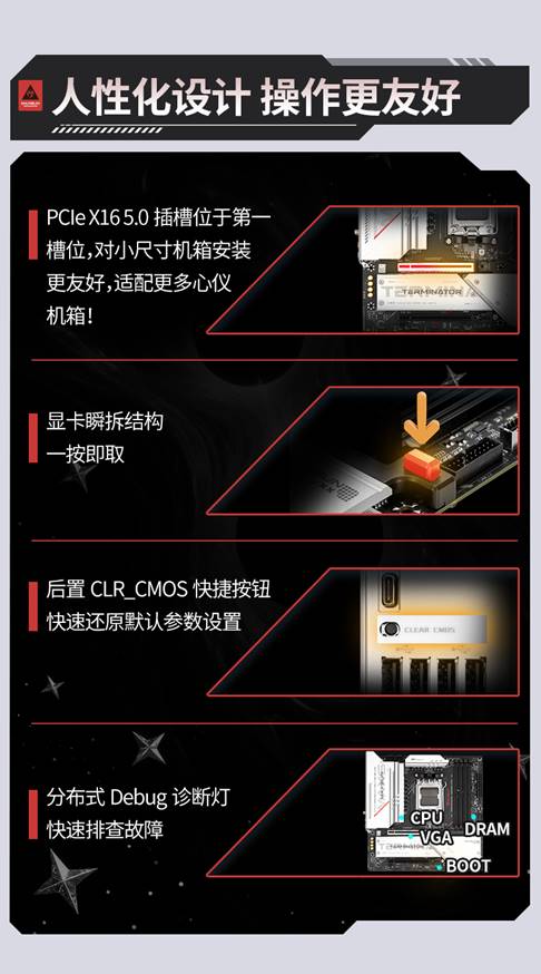 铭瑄Terminator B850M PRO WIFI主板还加入了许多贴心设计,如显卡瞬拆结构,装机维护时无需费力拆卸螺丝;分布式Debug诊断灯能快速定位故障,小白也能轻松排查问题;CLR_CMOS快捷按钮,让设置重置更便捷,全程省心省力,装机体验直接拉满。