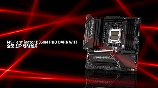 另外,铭瑄Terminator B850M PRO系列主板还推出了一款黑色版的铭瑄Terminator B850M PRO DARK WIFI。作为铭瑄终结者 PRO 系列的黑色款,这款主板将 “硬核美学” 贯彻到底,同样的暗红线条如机甲血脉般点缀,更大面积的全金属装甲采用喷砂与拉丝工艺交织,打造出如同未来机甲般的冷峻质感,低调中透着霸气。无论是搭配侧透机箱展示内部硬件,让每一处细节都成为视觉焦点;还是打造简约风、电竞风主机,这款黑色主板都能完美适配,轻松 hold 住各种装机风格,满足不同用户的审美偏好。