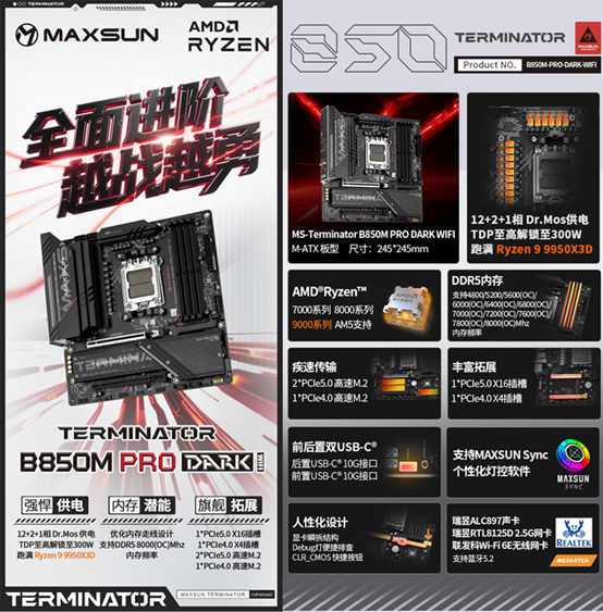 当然,年末新游的满帧畅玩,光有处理器的强势输出还不够,更离不开主板的稳定支撑与性能释放。铭瑄 Terminator B850M PRO 系列主板作为AMD AM5平台的 “黄金拍档”,兼容AMD锐龙 7000/8000/9000全系列处理器,实现"一板通吃"的灵活适配能力。