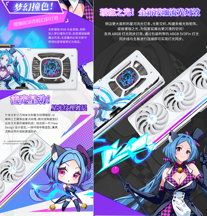 铭瑄GeForce RTX 5070 iCraft OC12G 瑷珈,这款显卡外观上延续温润质感的设计基调,升级ARGB灯光同步灯效,侧边创新加入星河流光灯条,灯光流转间如同赛博世界的魔法光芒,灵动又吸睛。高强度合金背板不仅提供稳固防护,更搭载 Q 版瑷珈灯效,萌力与科技感完美融合,让显卡静置时也成为桌面一道亮眼风景。