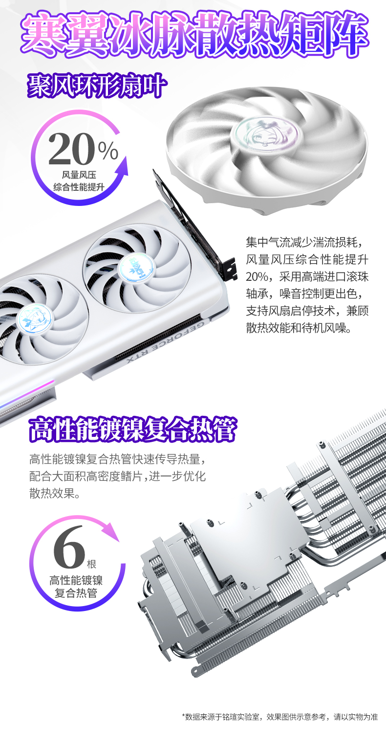 散热方面,这款显卡同样性能在线。3个10CM聚风环形扇叶搭配进口高端滚珠轴承,能集中气流减少湍流损耗,风量风压综合性能提升20%。配合高效镀镍复合热管与大面积高密度鳍片,大幅降低接触热阻,热量可迅速导出并高效散发。同时支持风扇启停技术,兼顾散热效能与待机静音体验。此外,该卡还支持MAXSUN GPU Control Center软件,玩家可轻松调节个性化灯效、进行超频设置与风扇转速调控,全方位释放显卡潜能。