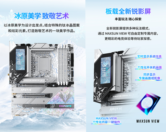 首先是铭瑄 iCraft Z890 Arctic主板,作为iCraft系列的高端型号,以 “北冰洋” 为设计灵感,采用冰原美学设计。特殊的钛冰晶图案搭配炫彩元素,整体色调统一且富有质感,摆在机箱中宛如一件冰雕艺术品,完美适配当下流行的白色主机风格,与《战地 6》的冰雪战场形成奇妙呼应。板载的全新锐影LED屏,不仅支持RGB光效同步,还能实时显示CPU温度、内存频率、供电状态等核心参数,更有多种玩法模式可选。这让你在激战《战地 6》时,无需频繁切换监控软件打断游戏,就能直观掌握硬件运行情况,实用性与观赏性拉满。