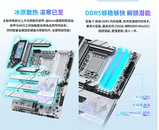 性能方面,这款主板采用16+1+1 相 DR.MOS 供电搭配 8 层服务器级 PCB,实现高性能与低损耗的完美平衡,能充分释放酷睿Ultra 200S系列处理器的性能。散热设计同样拉满,供电部分上方的冰原散热装甲由6mm镀镍铜管连接,装甲与MOS之间的接触面采用高品质导热硅条;同时配备金属固态硬盘冰原散热片,全面保障硬件冷静运行,性能持续在线不 “掉链”。内存与扩展能力也十分出色。它配备4条高速DDR5内存插槽,支持双通道内存技术,最高支持256GB容量,还拥有8800MHz (OC)超频潜能,搭配CUDIMM内存可轻松突破频率上限,让《战地6》的游戏纹理加载速度大幅提升,进入战场更快一步。