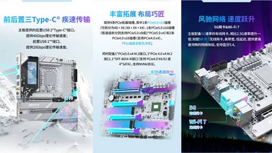 扩展方面,该主板提供4条PCle拓展插槽,其中1条PCIe 5.0 x16插槽支持灵活拆分,可根据需求调整为X8+X8 或 X8+X4+X4模式,满足同时搭载高性能显卡与PCIe扩展卡的需求;板载的SFF-8654 4i接口,可灵活扩展为PCIe 4.0 x4通道或4个 SATA 接口,适配多设备存储方案。I/O区域的两个40Gbps速率USB4 Type-C 接口,配合DP 1.4与HDMI 2.1视频接口,轻松满足多设备连接需求。网络体验同样无需担忧。它搭载 Intel BE200 无线网卡与 Realtek RTL8126 有线网卡,支持 Wi-Fi 7 与 5G 有线网络,还具备蓝牙 5.4 功能。无论是在复杂网络环境下进行 128 人联机对战,还是连接无线外设,都能实现低延迟、高稳定的传输,让你避免因网络波动错失战机。