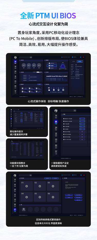 值得一提的是,铭瑄iCraft Z890 Arctic主板的 BIOS 界面经过全面升级,采用了 PTM UI BIOS。全新的 PTM UI BIOS 借鉴手机 APP 的交互逻辑,秉持 PTM 设计理念(PC To Mobile)。它先将所有功能模块化,再进行聚焦式设计,让所有交互层级不超过 2 层。手机端风格的卡片式体验界面,更符合现今用户的使用习惯,让复杂的 BIOS 设置变得高效、简单、易用,即使是新手也能轻松上手。