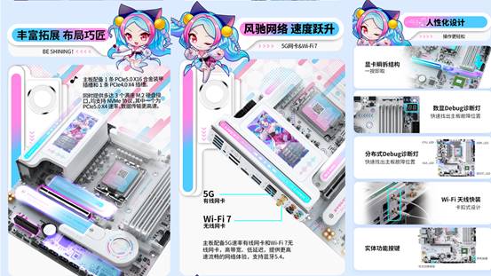 拓展性与网络体验更是直击玩家需求。该1条PCIe5.0 X16合金装甲插槽+1条 PCIe4.0 X4 插槽,搭配3个满速M.2硬盘接口和 4个6G SATA接口,无论是加装高速固态硬盘还是拓展其他硬件,都能从容应对。多人对战时就怕网络卡顿,这款主板搭载英特尔BE200无线网卡,支持Wi-Fi 7 和蓝牙5.4,再加上5G有线网口的双旗舰网络配置,传输速度又快又稳,让你在《战地6》的百人对战中告别延迟,快速响应每一次战术指令。更贴心的是,显卡瞬拆结构和 Wi-Fi天线快装设计让装机、升级更便捷,数显+分布式 Debug 诊断灯能一眼识别故障位置,省去繁琐排查步骤,让玩家专注享受装机与游戏的乐趣。
