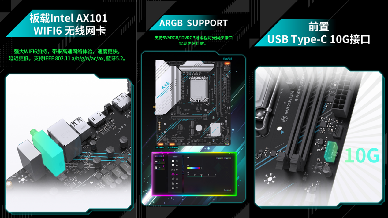 接口配置更是贴心又全面,后置IO接口丰富多样,涵盖 DP 1.2、HDMI 1.4 视频接口,轻松支持 4K 高清输出,满足影音娱乐需求;同时配备 2 个 USB 5G 接口、6 个 USB 2.0 接口,足以连接键盘、鼠标、硬盘等各类外设。更值得一提的是,主板贴心配备背部 CMOS 一键重置按钮,无需开盖即可快速恢复 BIOS 设置,轻松解决超频失误等突发问题;分布式 DEBUG 灯则能帮助用户快速定位主板故障,排查问题更高效。前置接口同样给力,提供 10Gbps 速率 Type-C 接口与 5Gbps USB 接口,适配高速外设接入;支持 5V ARGB/12V RGB 可编程灯光同步接口,搭配 MAXSUN SYNC 灯控软件,玩家可自由打造个性化光效主机,让颜值与性能并存。