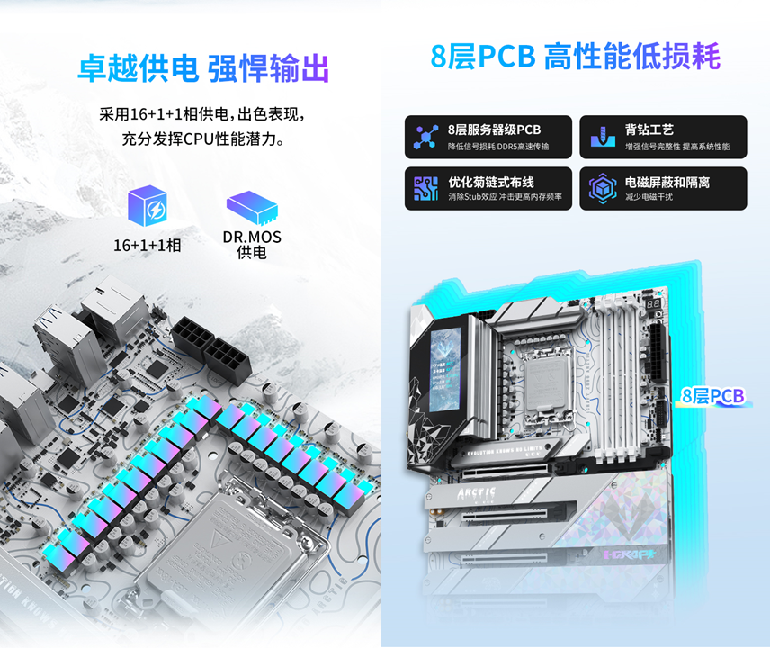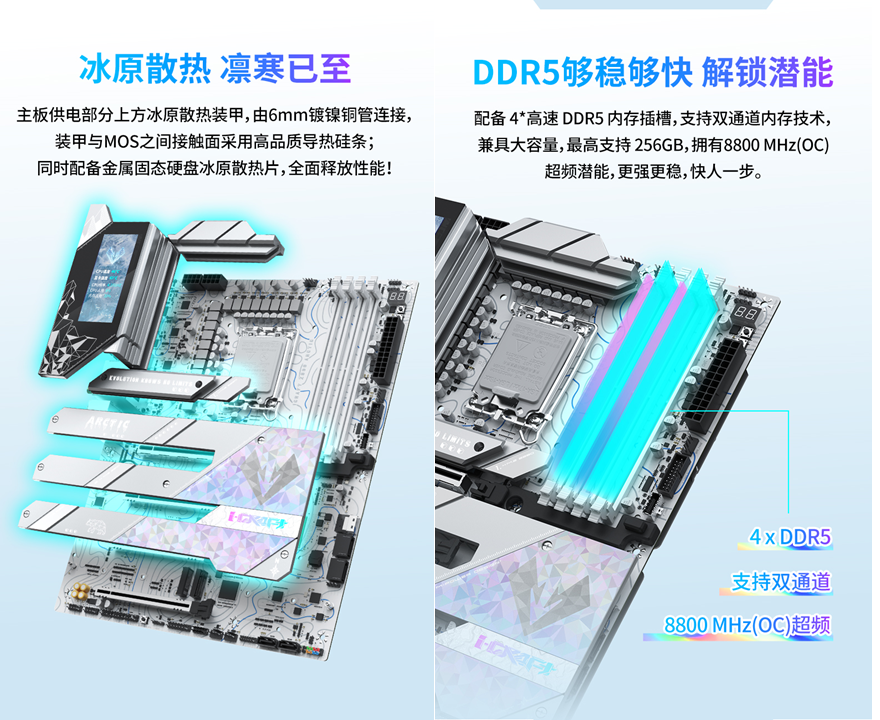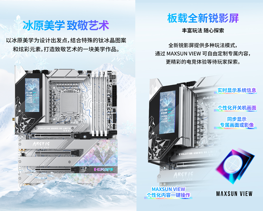 而要让这颗 “强芯” 充分释放潜能,离不开一块实力与颜值兼备的主板 —— 铭瑄 iCraft Z890 Arctic 正是这样的存在。这款主板作为iCraft系列的高端型号,以 “北冰洋” 为设计灵感,采用冰原美学设计。特殊的钛冰晶图案搭配炫彩元素,整体色调统一且富有质感,摆在机箱中宛如一件冰雕艺术品,完美适配当下流行的白色主机风格,摆放在机箱中,瞬间提升整机颜值。