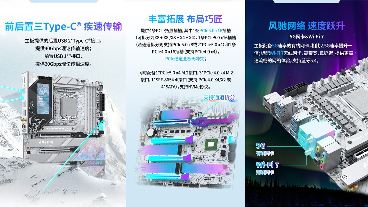 扩展方面,提供4条PCle拓展插槽,其中1条PCIe 5.0 x16插槽支持灵活拆分,可根据需求调整为X8+X8 或 X8+X4+X4模式,满足同时搭载高性能显卡与PCIe扩展卡的需求;板载的SFF-8654 4i接口,可灵活扩展为PCIe 4.0 x4通道或4个 SATA 接口,适配多设备存储方案。I/O区域的两个40Gbps速率USB4 Type-C 接口,配合DP 1.4与HDMI 2.1视频接口,轻松满足多设备连接需求。