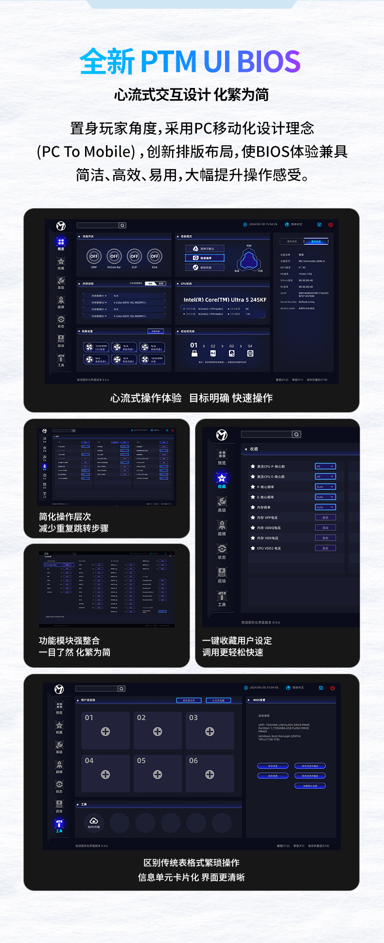 值得一提的是,铭瑄iCraft Z890 Arctic主板的 BIOS 界面全面升级为 PTM UI BIOS。借鉴手机 APP 的交互逻辑,采用模块化设计,交互层级不超过 2 层,手机端风格的卡片式界面,让复杂的 BIOS 设置变得简单易懂,即使是新手玩家也能轻松上手。