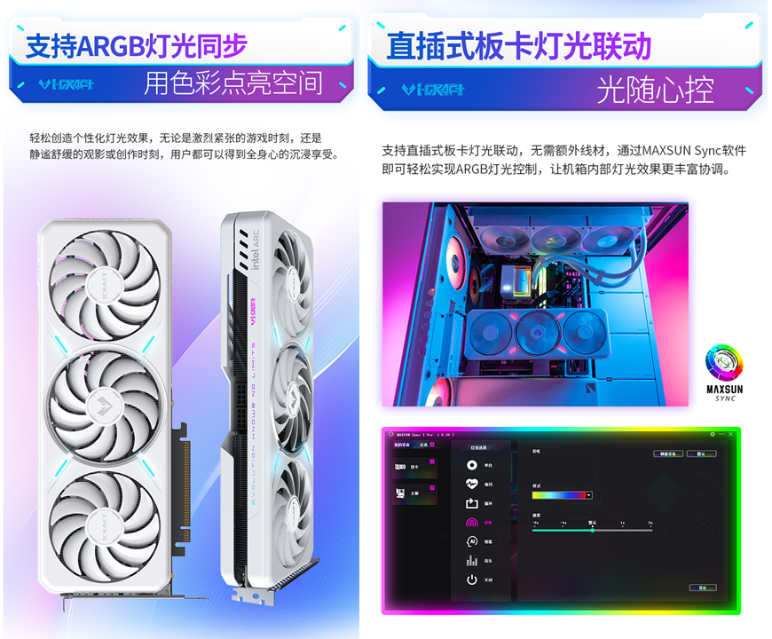 更贴心的是,它支持直插式板卡灯光联动,无需额外线材,通过MAXSUN Sync软件即可实现ARGB灯光控制,在《三角洲》中切换不同场景时,机箱内的灯光也能随之变化,与游戏场景遥相呼应,沉浸式体验直接拉满。