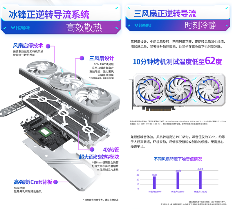 针对游戏的高负载场景,这款显卡采用创新的正逆转导流散热系统,三风扇相邻旋转方向不同,显著减少气流干扰并提升进风效率,让温度更低,噪音控制表现更好。在10分钟Time Spy烤机测试中,MAXSUN Intel Arc B580 iCraft 12G显卡温度仅为62℃,以游刃有余的冷静表现,守护每一分性能的稳定输出。