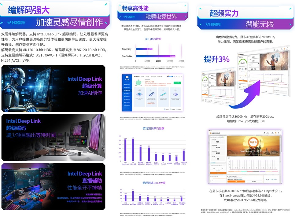 除了强散热优势,这款显卡还拥有高频率的卓越潜能。MAXSUN Intel Arc B580 iCraft 12G出厂Turbo频率高达2850MHz,通过在驱动中进行超频,频率甚至可以进一步提升至3000MHz以上,为《三角洲》带来更高的帧率与更细腻的画质表现。接口方面,提供3个DP2.1和1个HDMI2.1a输出接口,轻松满足多屏体验与高清视觉需求。此外,它的编解码能力也十分卓越,双硬件编解码器支持AV1、H265和H264等主流编解码格式,还支持了HAVC-H解码,不仅能为游戏直播提供清晰流畅的画面输出,还能大幅提升专业摄影剪辑的效率,兼顾游戏与创作双重需求。