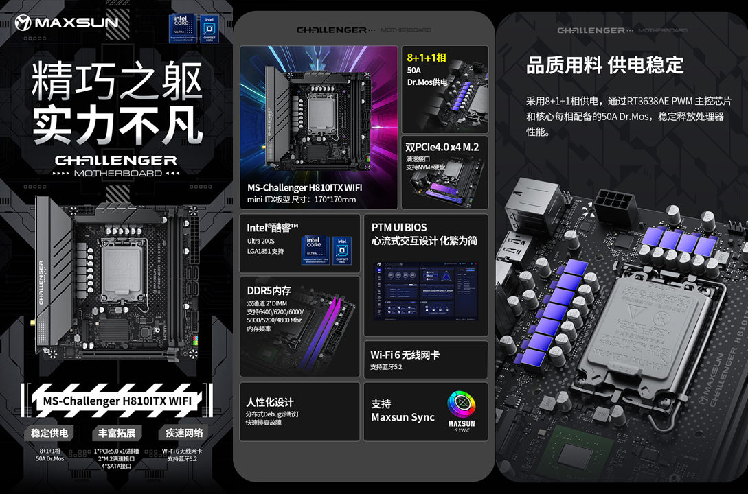 想要发挥处理器性能、连接各类硬件,一款适配性强、功能全面的主板至关重要。铭瑄Challenger H810ITX WIFI主板专为紧凑型主机设计,17cm×17cm的标准ITX 版型,能轻松装入市面上绝大多数迷你机箱,同时在供电、拓展、稳定性上毫不妥协,堪称“小而全”的典范。这款主板采用8+1+1相供电设计,搭配RT3638AE PWM主控芯片与每相 50A Dr.Mos ,供电电流稳定且供电能力充足。即便处理器处于高负载运行状态,也能持续提供稳定电力,避免因供电不足导致的性能波动,能充分释放英特尔酷睿Ultra 5 230F处理器的性能。
