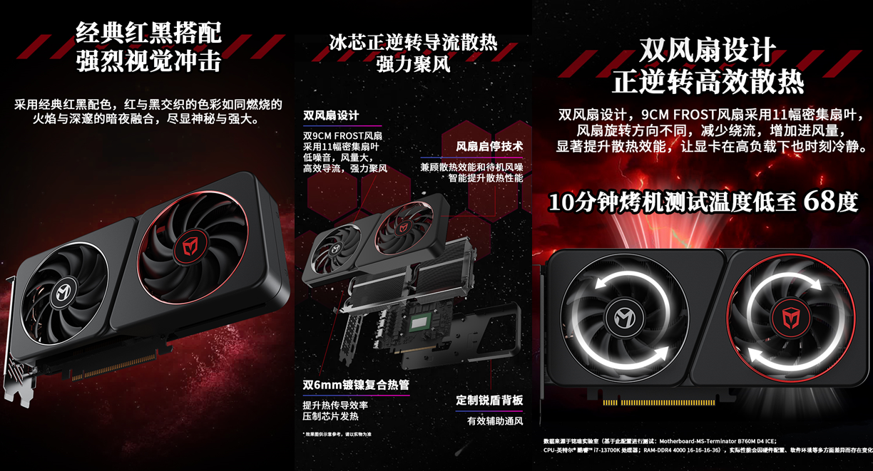 这款显卡外观设计上经典红黑配色很具视觉冲击力,红与黑交织如同火焰撞入暗夜,神秘又霸气,放在桌面就是颜值担当。核心性能更是硬核,20 个 Xe 内核搭配 2850MHz 超高加速频率,无论是 3A 游戏的高负载场景,还是专业创作的算力需求,都能流畅响应;12GB GDDR6 大显存 + 456GB/S 高速带宽,数据传输无瓶颈,复杂多任务处理也游刃有余。散热与实用功能双在线:双 9CM FROST 正逆转风扇搭配 11 幅密集扇叶,减少绕流、提升进风量,配合双 6mm 镀镍复合热管与定制锐盾背板,10 分钟烤机温度低至 68℃,高负载下也能冷静运行;支持风扇启停技术,兼顾散热效能与待机静音。接口配置丰富实用,3 个 DP2.1+1 个 HDMI2.1a 接口,多屏显示、超高清影音、高分辨率游戏需求全覆盖,还搭载双硬件编解码器,支持 AV1 格式与 Intel Deep Link 超级编码,让直播推流更顺畅,视频剪辑导出速度大幅提升,创作效率直接翻倍。