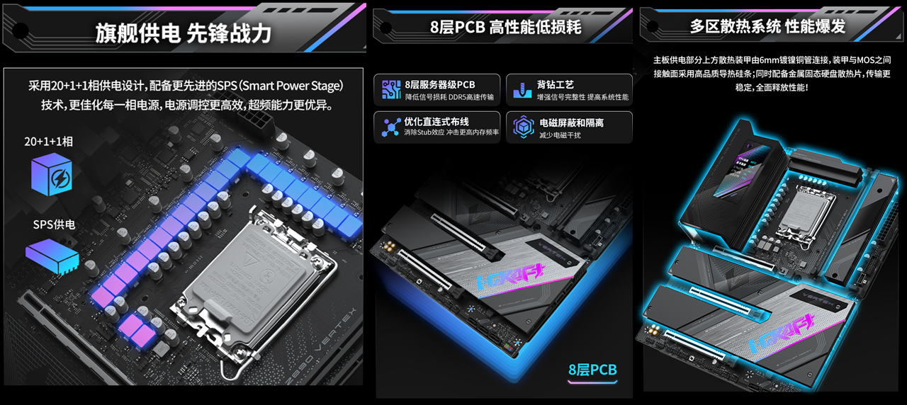 作为铭瑄 iCraft 系列的旗舰力作,铭瑄iCraft Z890 Vertex(珠峰)主板像是整套硬件的 “性能中枢”,搭载20+1+1相SPS供电设计,搭配8层服务器级PCB,实现高性能低损耗,能充分释放英特尔酷睿Ultra 9 285K处理器的澎湃性能,即便长时间高负载运行也能稳定输出,为显卡发挥强悍性能筑牢基础。散热配置更是拉满,供电部分的散热装甲由6mm镀镍铜管连接,装甲与MOS之间贴合高品质导热硅条,加上金属固态硬盘散热片,全面保障硬件冷静运行,避免长时间高负载游戏中的掉帧卡顿问题。