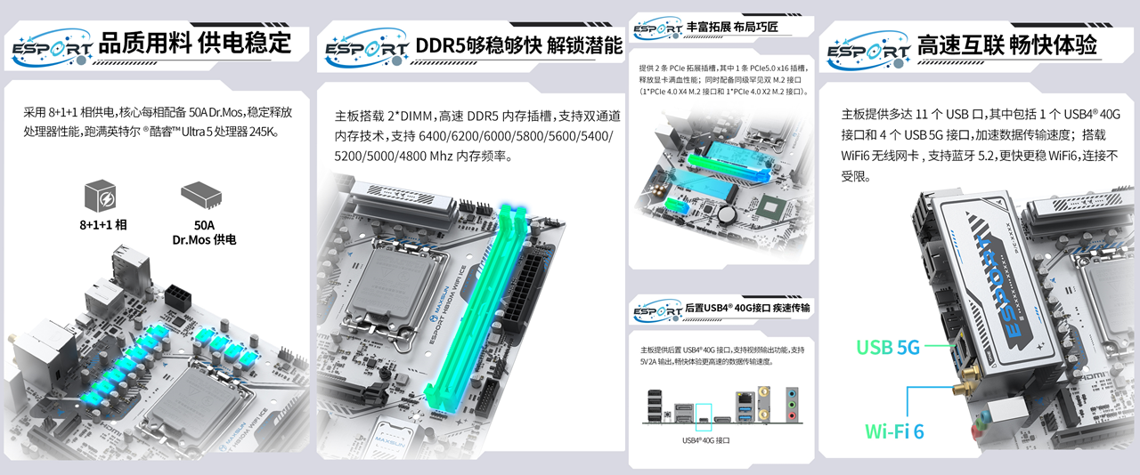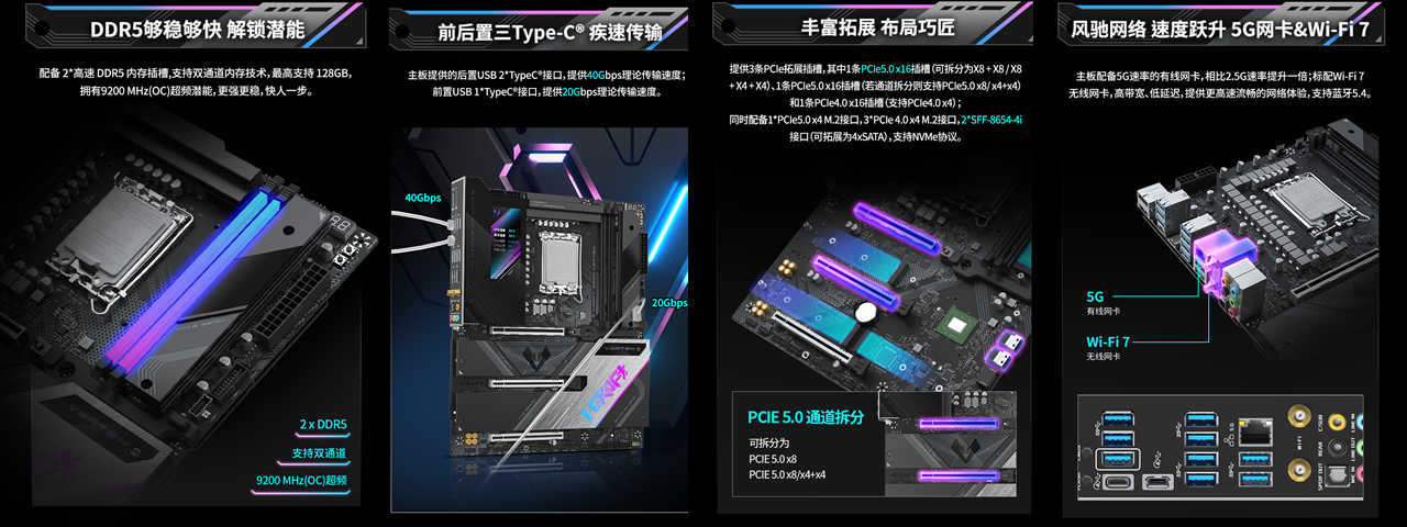 在拓展与体验上,这款主板也是诚意满满。配备2 条高速 DDR5 内存插槽,支持双通道技术与最高 128GB 容量,更拥有9200MHz(OC)超频潜能,搭配CUDIMM内存可轻松突破频率上限,大幅提升新游纹理加载速度,告别画面延迟;3 条 PCIe 拓展插槽搭配多规格 M.2 接口,完美兼容大容量高速固态硬盘与多硬盘存储阵列,再多新游也能 “尽收囊中”;Intel BE200 Wi-Fi7 无线网卡 + 5G 速率有线网卡,配合蓝牙 5.4,让联机玩《恶煞车手》时告别网络延迟,再也不会因网络波动错失战机。