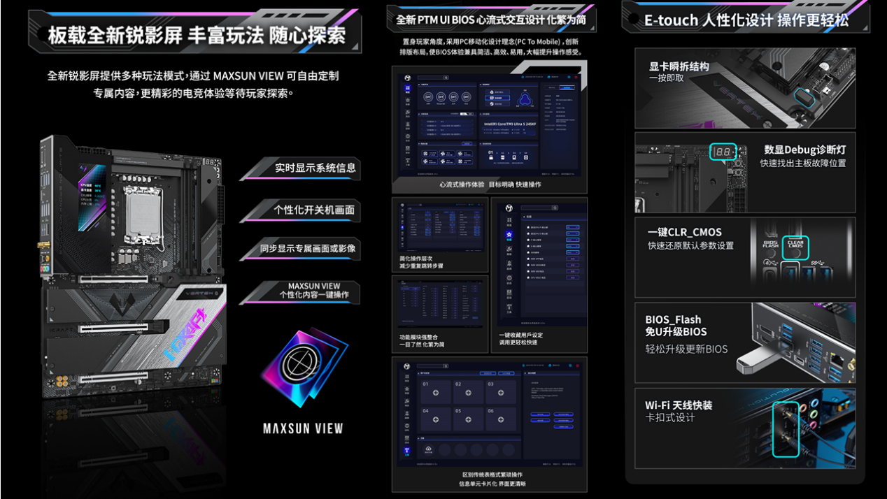 更贴心的是,板载的全新锐影 LED 屏就像硬件的 “智能仪表盘”,实时显示 CPU 温度、内存频率等核心参数,无需切换软件就能掌握硬件状态,颜值与实用性双在线;升级的 PTM UI BIOS 采用心流式交互设计,装机新手也能轻松上手,数显 Debug 诊断灯、一键 CLR_CMOS 等设计,让硬件调试全程省心。
