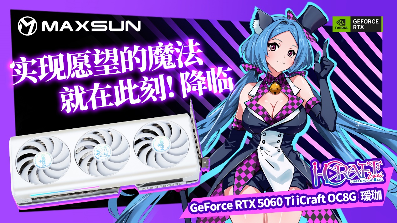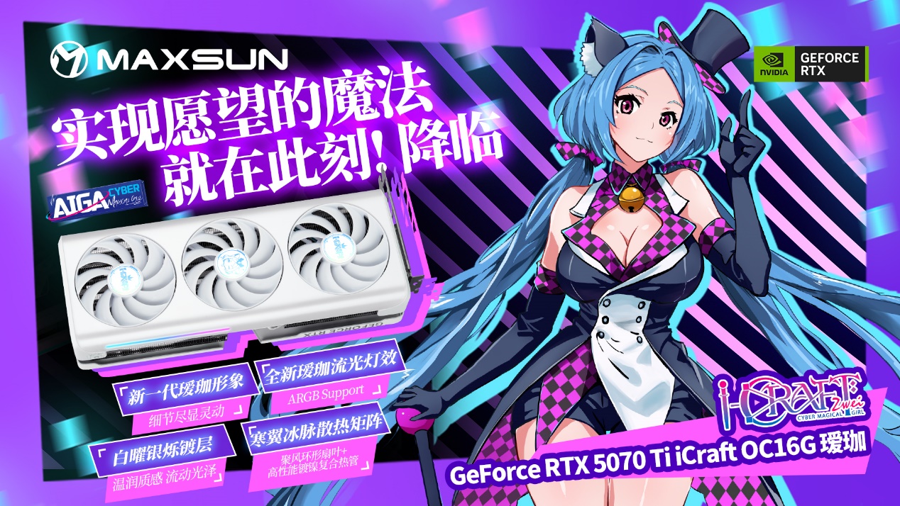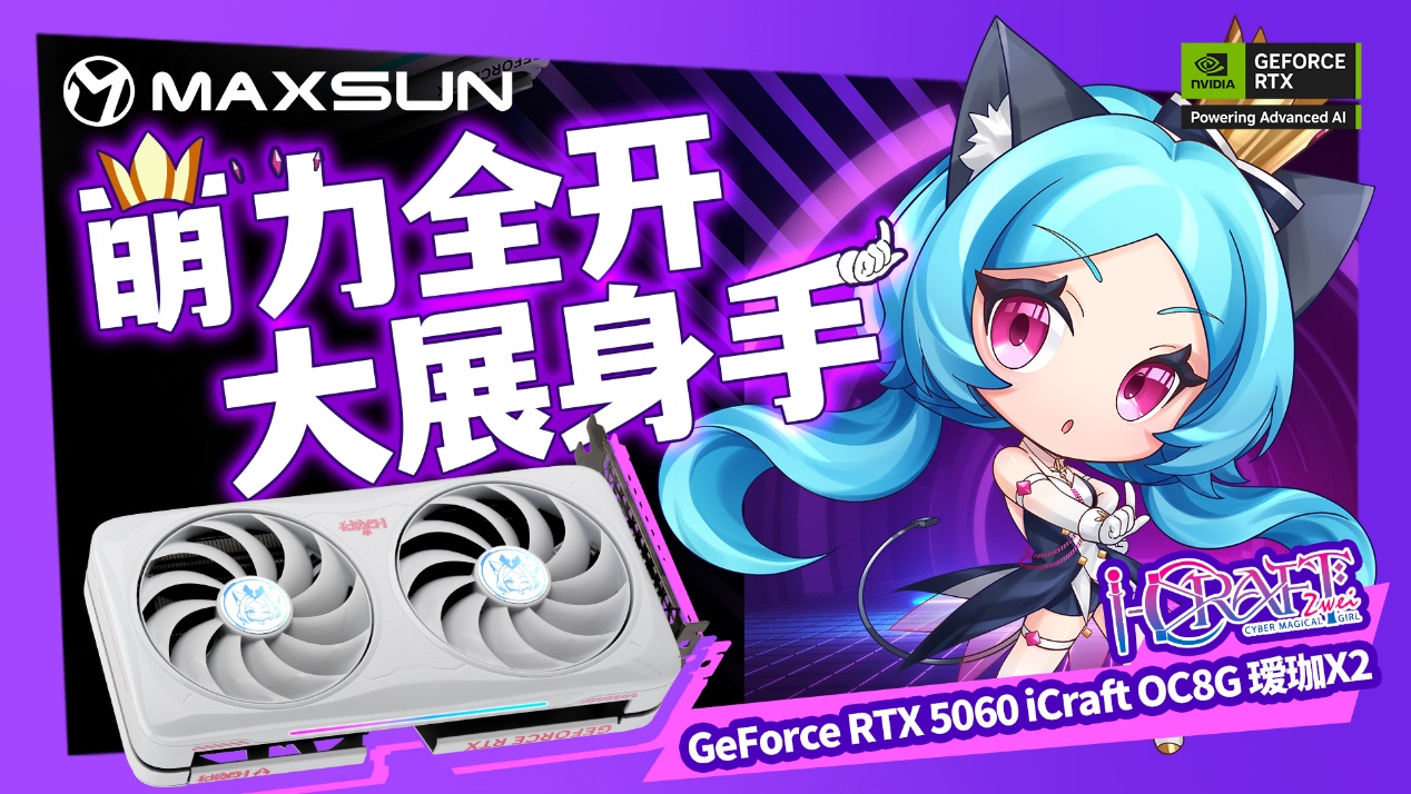 铭瑄GeForce RTX 5060 iCraft OC8G瑷珈 X2 显卡延续温润白色外观,IP视觉升级,全新 Q 版瑷珈形象亮相背板,萌力十足,侧边的星河流光灯条搭配 ARGB 灯光同步,让主机颜值再上一个台阶;散热方面,10CM 聚风环形扇叶集中气流、减少损耗,进口高端滚珠轴承控制噪音,风扇启停技术兼顾散热与静音,高性能镀镍复合热管与大面积鳍片,让热量快速导出。更贴心的是,这款显卡只需 550W 电源就能支撑整机稳定运行,无需额外升级电源,进一步降低装机成本,让入门玩家以高性价比解锁游戏快乐。