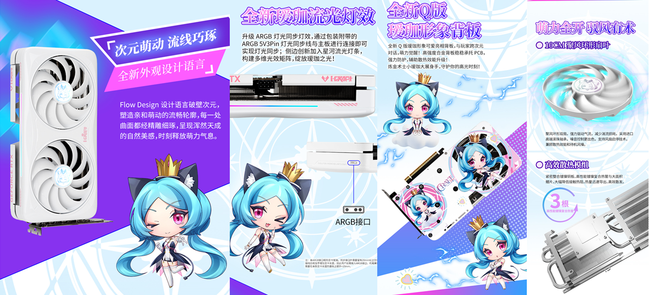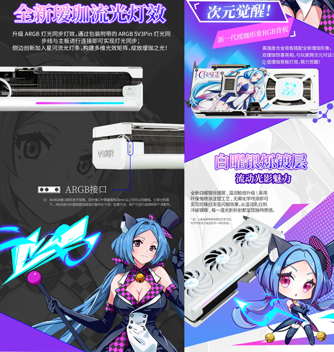 这款显卡不仅性能硬核,颜值更是戳中二次元玩家的心。升级后的白曜银烁镀层搭配亿万纳米光刻星光纹理,环保注塑工艺打造出珍珠白渐变闪银效果,光线流转间,璀璨的光影轨迹在显卡表面流动,触感温润又高级;一体环抱式中框让线条更流畅,侧边的星河流光灯条搭配瑷珈 RGB 合金背板,构建出多维光效矩阵,每一缕光影都透着专属的二次元氛围,支持 ARGB 灯光同步后,更是让显卡成为个性化主机的颜值担当。