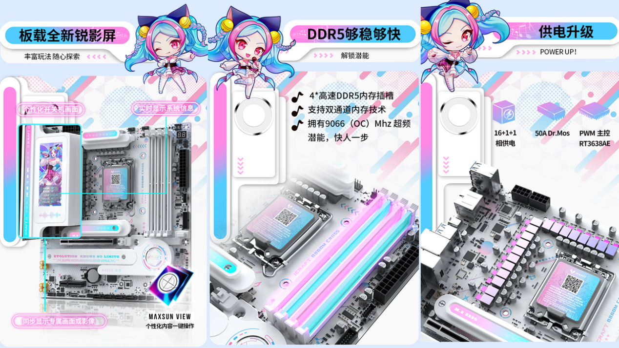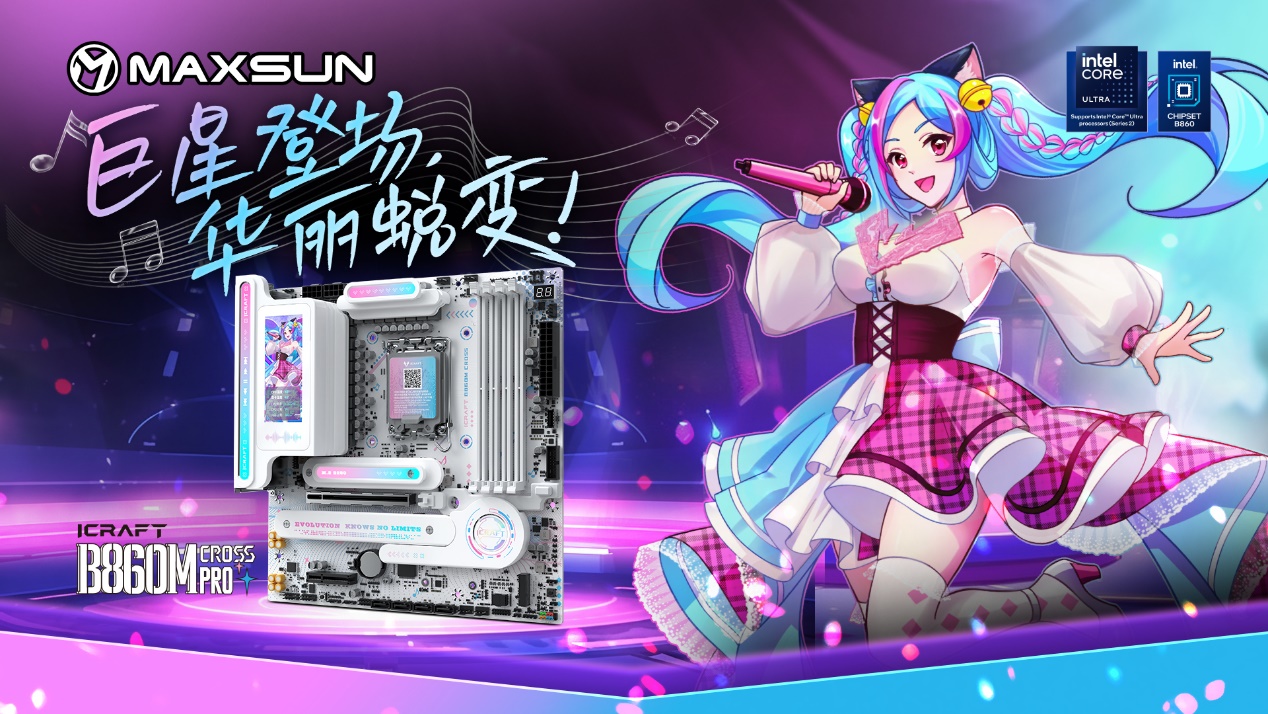 铭瑄iCraft B860M CROSS PRO瑷珈主板,是颜值与性能兼具的 “实力选手”。 它采用 16+1+1 相供电设计,核心供电 50A Dr.Mos,能轻松驾驭英特尔酷睿 Ultra 9 285K 处理器,为 2K 游戏提供稳定的性能支撑;4 条高速 DDR5 内存插槽支持双通道技术,拥有 9066MHz(OC)超频潜能,搭配 CUDIMM 内存可突破频率上限,大幅提升新游纹理加载速度,让游戏画面更流畅。颜值与体验上,这款主板的 3.4 英寸锐影 LED 屏堪称吸睛亮点,不仅能实时显示系统信息、自定义个性化开关机画面,还能开启桌面映射,同步显示专属画面或影像,通过 MAXSUN View 软件可解锁无限自定义玩法,让主机更有专属感;全面支持的 PTM UI BIOS,操作简洁高效,新手也能轻松上手。