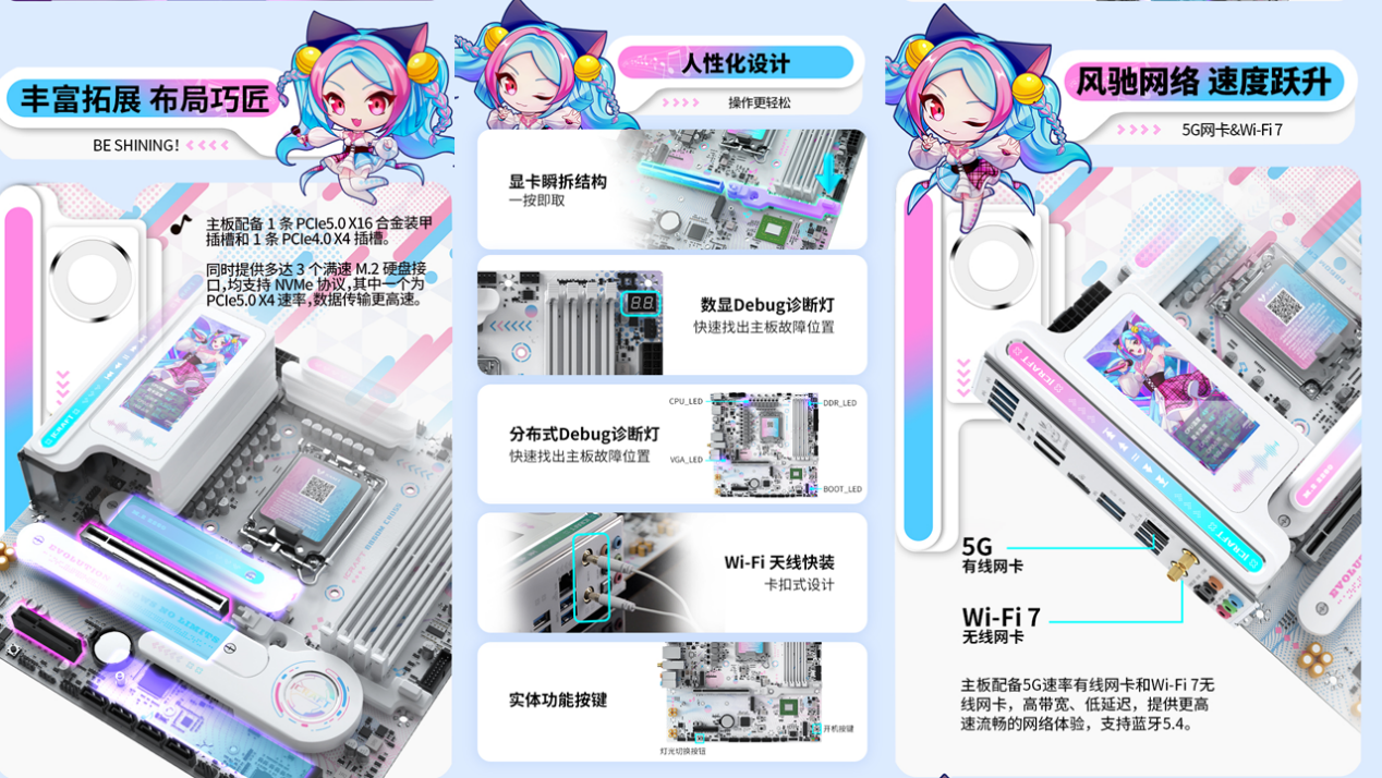 在拓展与实用设计上,这款主板同样贴心。1 条 PCIe5.0 X16 合金装甲插槽 + 1 条 PCIe4.0 X4 插槽,搭配 3 个满速 M.2 硬盘接口与 4 个 6G SATA 接口,满足各类拓展需求,再多游戏与资料也能轻松容纳;前后置双 USB-C、后置 USB4 40G 接口,支持最高 40Gbps 传输速率,数据传输快人一步;5G 速率有线网卡 + Wi-Fi7 无线网卡,配合蓝牙 5.4,高带宽低延迟,联机游戏再也不怕网络拖后腿;显卡瞬拆结构、Wi-Fi 天线快装卡扣,让硬件拆装更便捷,数显 + 分布式 Debug 诊断灯,一眼就能识别故障位置,省去繁琐的排查步骤,让玩家把更多时间留给游戏。