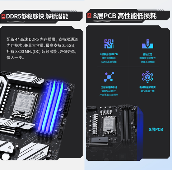 针对新处理器内存控制器的升级,铭瑄 Terminator Z890-A WIFI 主板在内存拓展与优化上做到完美适配。这款主板配备 4 条 DDR5 DIMM 内存插槽,支持双通道技术,最大内存容量可达 256GB,更拥有高达 8800MHz 的超频潜能,不仅兼容新处理器原生支持的 DDR5-7200 MT/s 内存,还能满足硬核玩家的超频需求,充分挖掘内存性能潜力。此外,主板采用 8 层服务器级 PCB 设计,结合背钻工艺与菊链式优化布线,有效降低高频信号传输中的损耗与串扰,消除电磁干扰与 Stub 效应,确保内存高速稳定传输,让内存读写速度与多任务响应速度再创新高,与英特尔酷睿 Ultra 200S Plus系列处理器协同发力,实现 15% 的游戏性能提升。