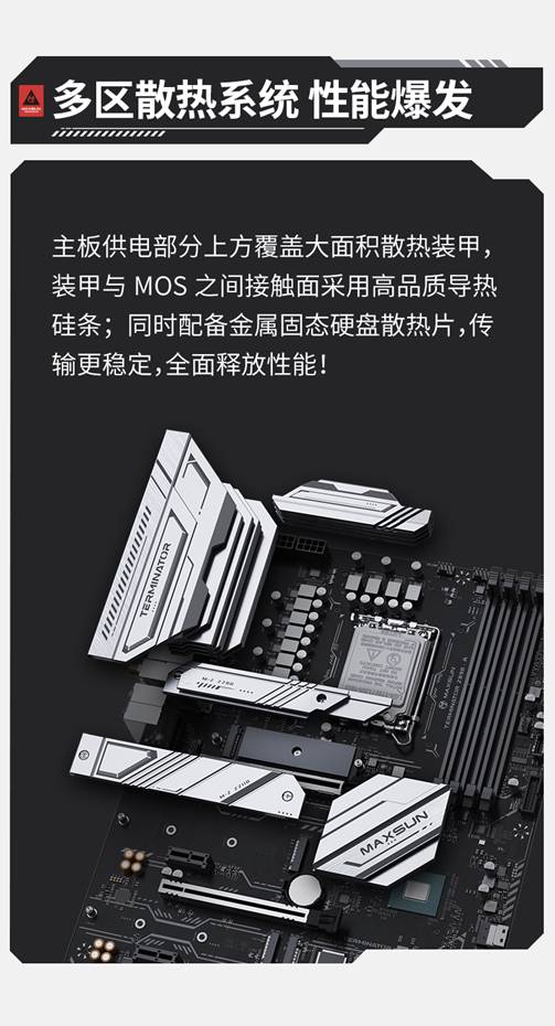 为保障高负载下的长期稳定运行,铭瑄 MS-Terminator Z890-A WIFI 主板在散热设计上同样下足了功夫,打造多区协同散热系统,为性能释放保驾护航。主板供电部分上方覆盖了大面积散热装甲,装甲与 MOS 之间的接触面采用高品质导热硅条,能够快速导出供电模块工作时产生的热量;同时,主板还配备了金属固态硬盘散热片,有效降低固态硬盘在高速传输数据时的温度,确保其传输稳定性,全面释放存储性能。在这套高效散热系统的加持下,即便英特尔酷睿 Ultra 200S Plus系列处理器满负载运转,主板也能保持较低温度,避免因过热导致的性能降频,让玩家在长时间鏖战游戏或进行专业创作时无后顾之忧。