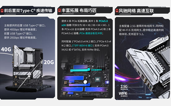 在拓展性方面,该主板展现出了强大的兼容性和实用性,能够满足玩家多样化的硬件拓展需求。主板提供 4 条 PCle 拓展插槽,其中 1 条 PCle5.0 x16 插槽(可拆分为 X8+X8/X8+X4+X4)、1 条 PCle x16 全长插槽(支持 PCle4.0 x4)和 2 条 PCle4.0 x1 插槽,全板 PCle 通道无冲突。存储接口方面,主板配备 1 个 PCle5.0 x4 M.2 接口、3 个 PCle4.0 x4 M.2 接口以及 1 个 SFF-8654 4i 接口(支持 PCle4.0 X4/X2 或 4*SATA),且均支持 NVMe 协议。此外,主板还配备前后置双 Type-C 接口,后置 USB Type-C 接口理论传输速度可达 40Gbps,前置 USB Type-C 接口理论传输速度为 20Gbps,轻松实现疾速传输,满足玩家的高效数据交互需求。网络体验也不拉胯,主板配备 2.5G 速率有线网卡和 Wi-Fi 6 无线网卡,同时支持蓝牙 5.2,有线、无线双模式自由选择,无需额外升级。不管是游戏对战时的低延迟需求,还是远程办公的稳定连接要求,都能轻松应对。