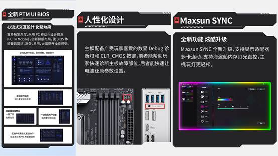 除了强悍的性能,这款主板在操作便捷性和个性化上也格外贴心。全新升级的 PTM UI BIOS,借鉴了手机 APP 的交互逻辑,采用模块化设计,交互层级不超过 2 层。卡片式的界面一目了然,就算是装机新手,也能轻松搞定 BIOS 设置。分布式 Debug 诊断灯和 CLR_CMOS 快捷按钮,更是能快速定位故障,让装机过程省心又省力。它还支持RGB光效同步,可与显卡、内存等外设实现灯光联动,炫酷灯光效果随心切换,无论是打造酷炫的黑色电竞主机,还是组装颜值爆表的纯白海景房,都能完美适配,轻松拿捏氛围感。