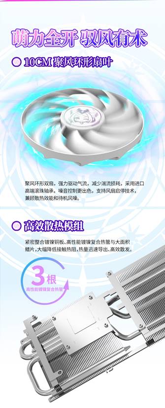 这款显卡配备了10CM聚风环形扇叶,能集中气流减少湍流损耗,采用进口高端滚珠轴承,噪音控制更出色,还支持风扇启停技术,兼顾散热效能和待机风噪。高效散热模组紧密整合镀镍铜板、高性能镀镍复合热管与大面积鳍片,大幅降低接触热阻,让热量迅速导出、高效散发,为稳定运行保驾护航。
