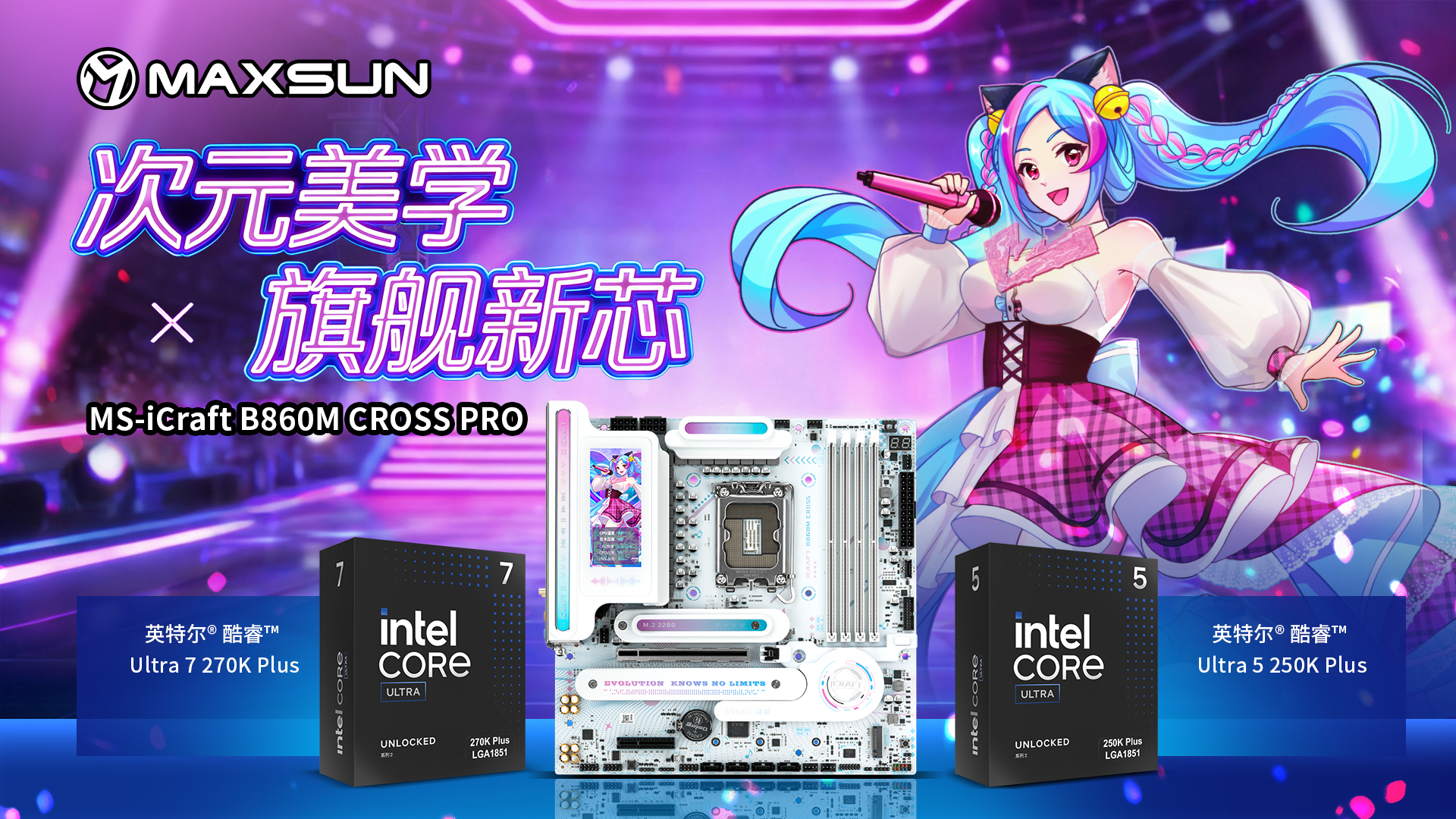 英特尔® 酷睿™ Ultra 200S Plus 系列处理器将于本周四 3 月 26 日重磅开售,酷睿 Ultra 7 270K Plus 与酷睿 Ultra 5 250K Plus 两大旗舰型号携架构深度优化与核心规格全面升级而来,为玩家打造了更强性能体验与突破性综合价值。而铭瑄 iCraft B860M CROSS PRO主板,以二次元的高颜值设计和旗舰级的硬件规格,完美适配新处理器的性能需求,不仅能充分释放酷睿 Ultra 200S Plus系列处理器的潜能,更以高性价比和个性化设计,成为打造个性化白色主机玩家的不二之选。新芯开售之际,二者强强联手,为玩家解锁颜值与性能双满配的全新硬件体验!