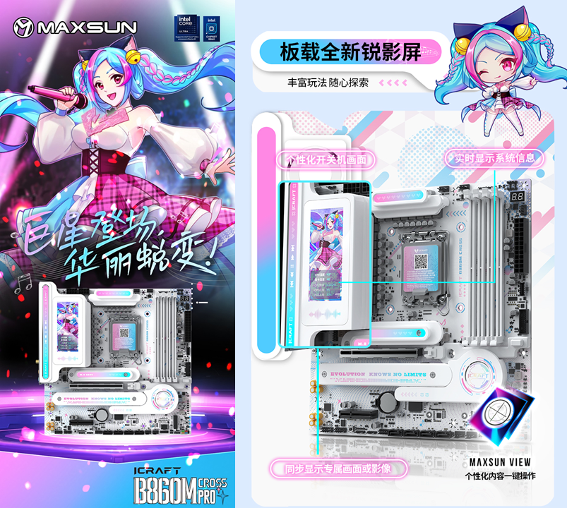 作为颜值旗舰,铭瑄iCraft B860M CROSS PRO瑷珈主板将次元美学融入硬件设计。主板全覆盖着蓝粉渐变的二次元纹路,每一处细节都透着精致感。吸睛亮点莫过于全新配备的3.4英寸锐影LED显示屏,不仅能实时显示CPU温度、内存频率等系统信息,让玩家随时掌握硬件状态,还能自定义开关机画面,甚至支持桌面映射,同步展示专属壁纸或游戏画面。搭配配套软件MAXSUN View,玩家可以尽情解锁无限自定义玩法,让主板成为主机的 “个性门面”。