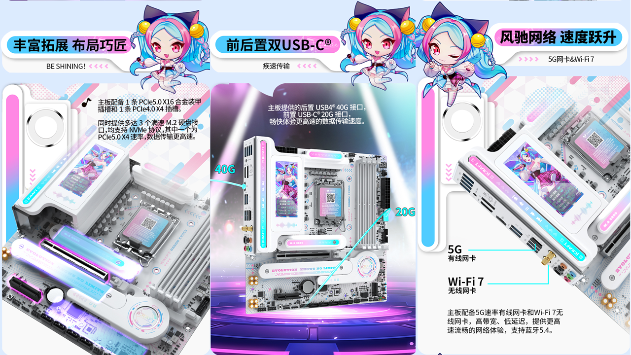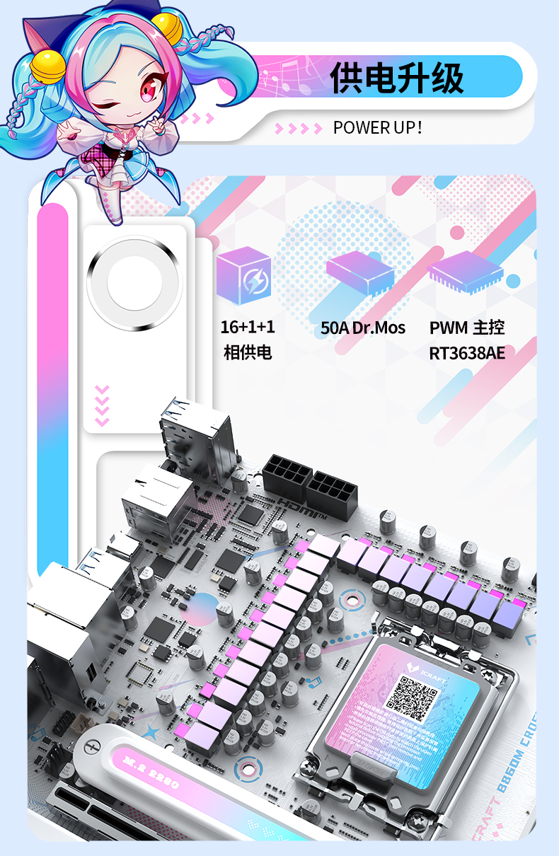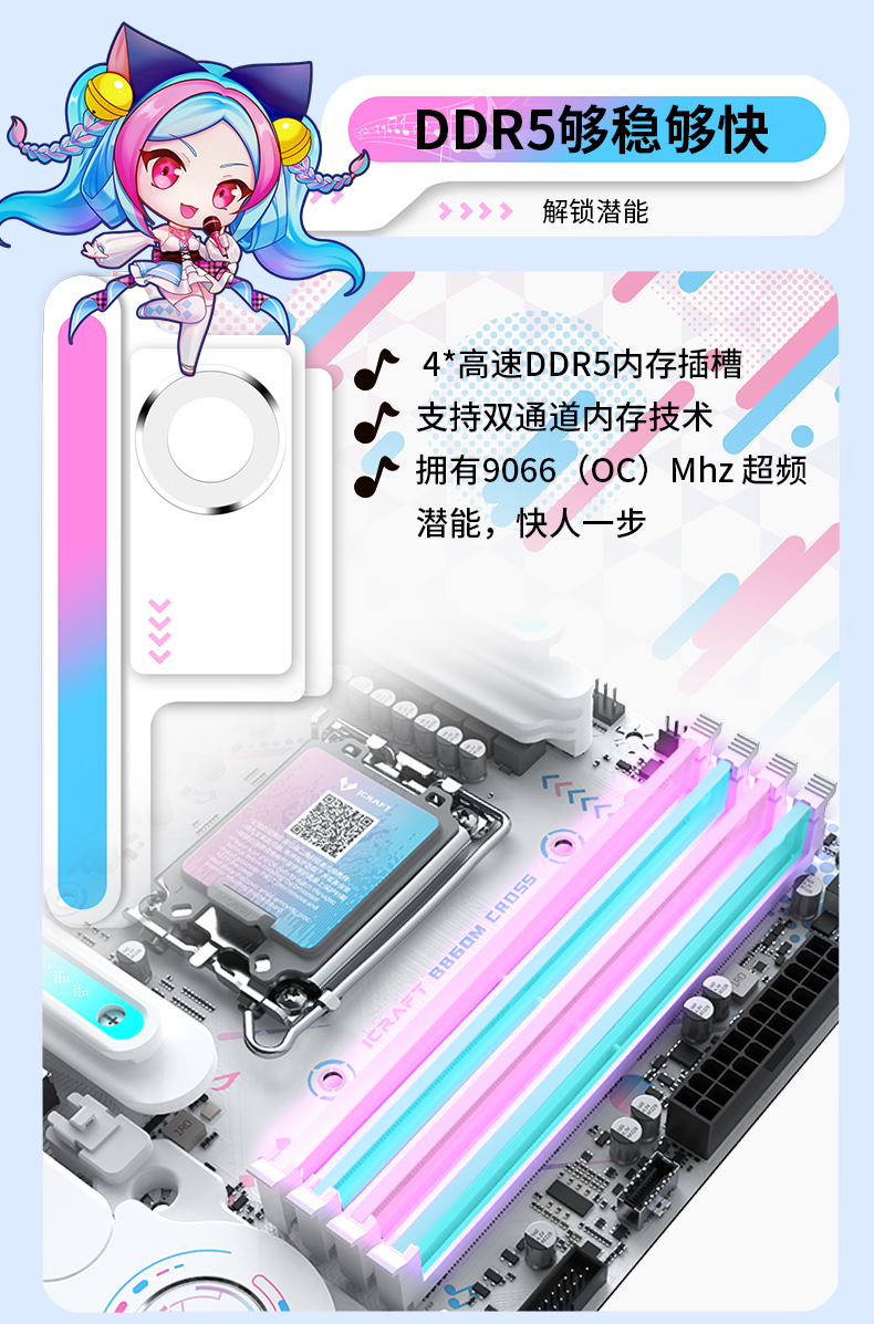 铭瑄 iCraft B860M CROSS PRO主板凭借二次元美学设计、强悍的供电性能、出色的内存潜力、丰富的拓展接口、稳定的网络连接、便捷的操作体验和个性化的灯光效果,成为英特尔酷睿Ultra 200S Plus系列处理器的新芯性能搭档,更是打造个性化主机玩家的装机优选。3 月 26 日新处理器正式开售,选择铭瑄 iCraft B860M CROSS PRO主板,让你在打造高颜值个性化主机的同时,轻松解锁新芯满帧战力,从容迎战游戏、创作、办公等各类使用场景,开启颜值与性能双在线的硬件全新体验!