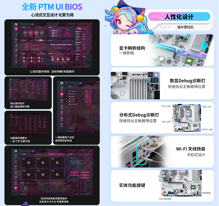 除了强悍的性能与丰富的功能,铭瑄 iCraft B860M CROSS PRO主板在操作便捷性和个性化打造上,也格外贴心,全方位提升用户的使用与装机体验。全新升级的 PTM UI BIOS,借鉴了手机 APP 的交互逻辑,采用模块化设计,交互层级不超过 2 层,卡片式的界面一目了然,就算是装机新手,也能轻松搞定 BIOS 设置。同时主板配备显卡瞬拆结构和 Wi-Fi天线快装设计,无需繁琐操作,让装机、硬件升级更便捷;数显+分布式 Debug 诊断灯能一眼识别故障位置,省去繁琐排查步骤,让玩家专注享受装机与游戏的乐趣。